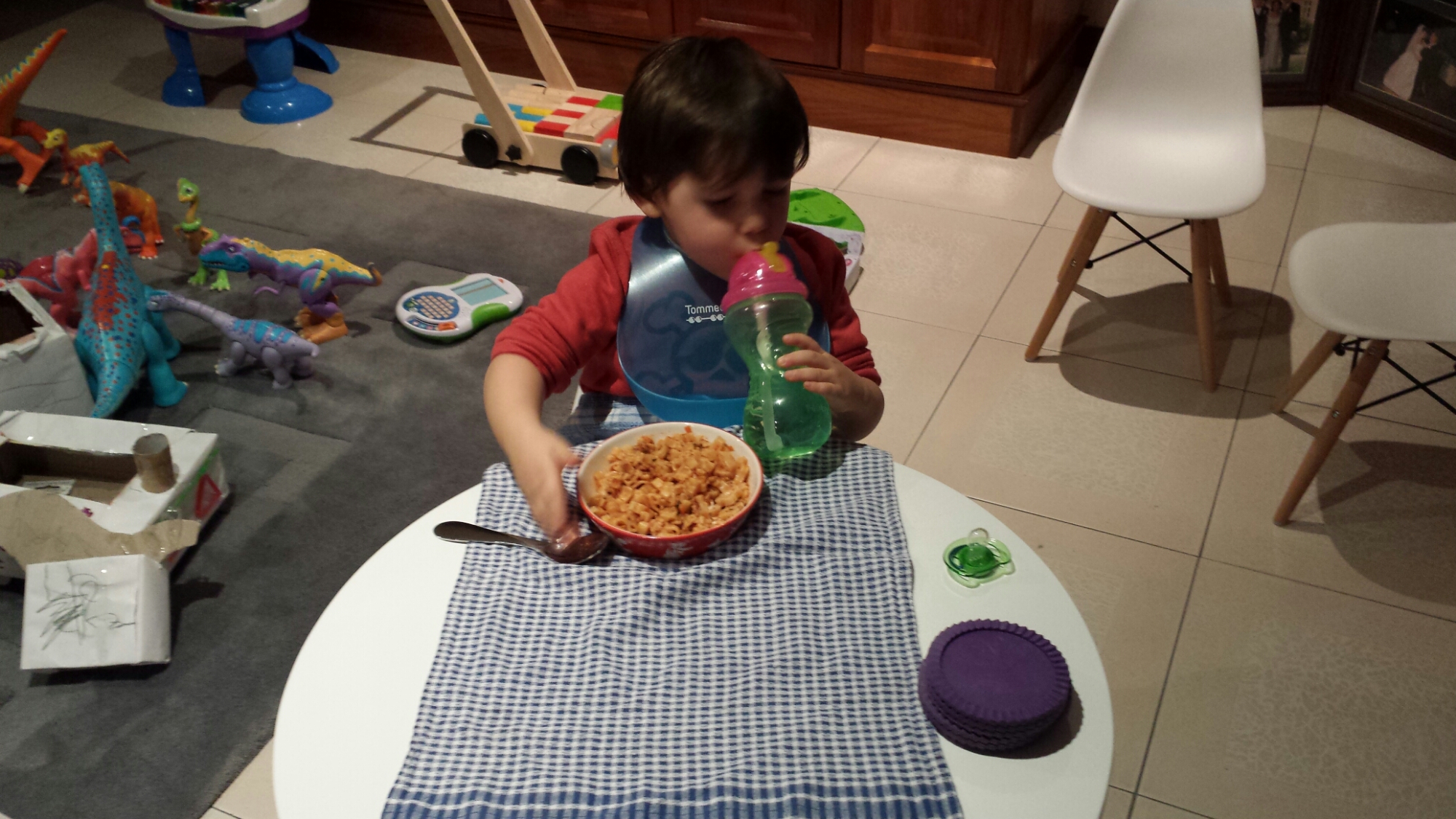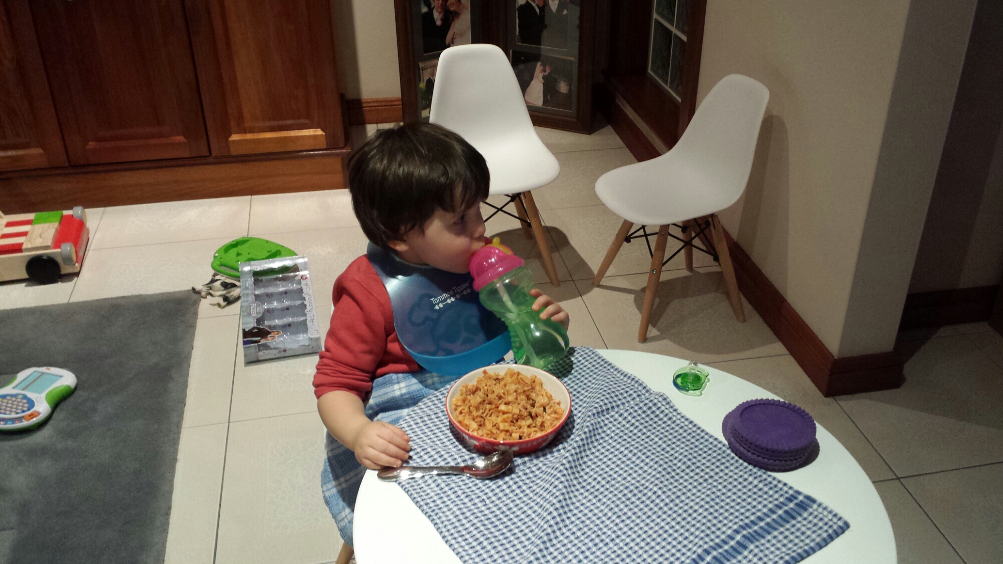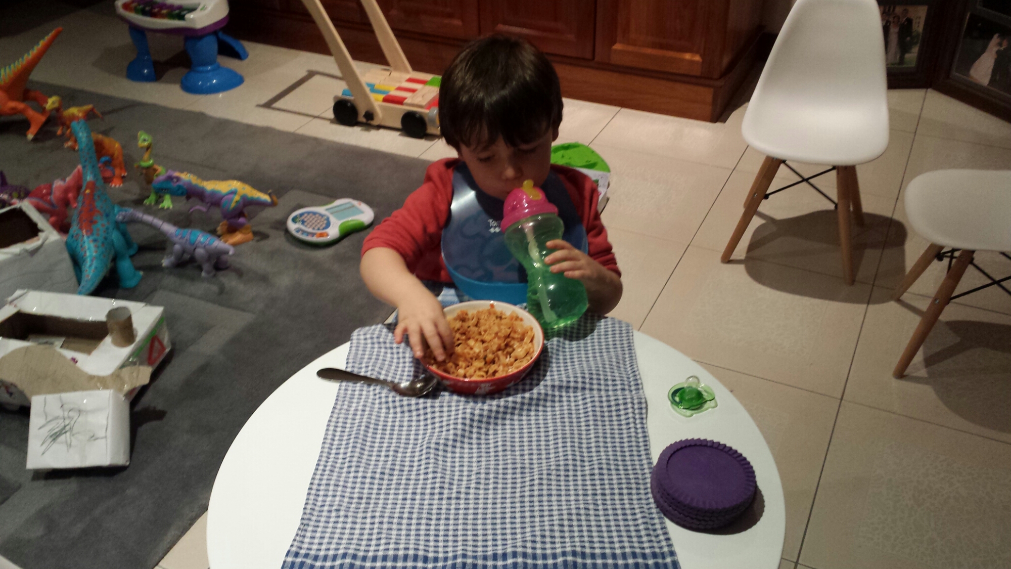 Dinner time, Mummy said that we can all have dinner at my table tonight