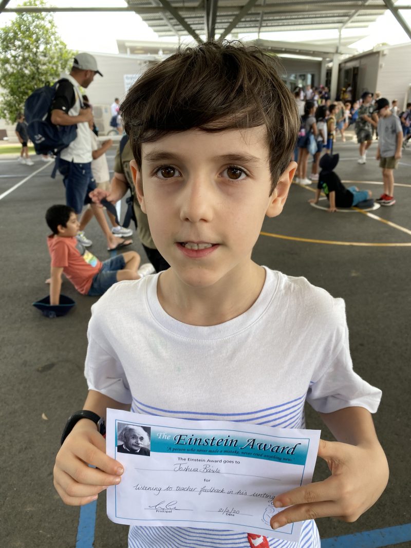 I finally did it, I got the Einstein Award for ‘Listening to teacher feedback in his writing’. Mum & Dad are so proud of me!